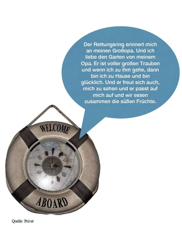 »Ich liebe den Garten von meinem Opa. Er ist voller großer Trauben und wenn ich zu ihm gehe, dann ich zu Hause und bin glücklich. Und er freut sich auch, mich zu sehen und er passt auf mich auf und wir essen zusammen die süßen Früchte.«